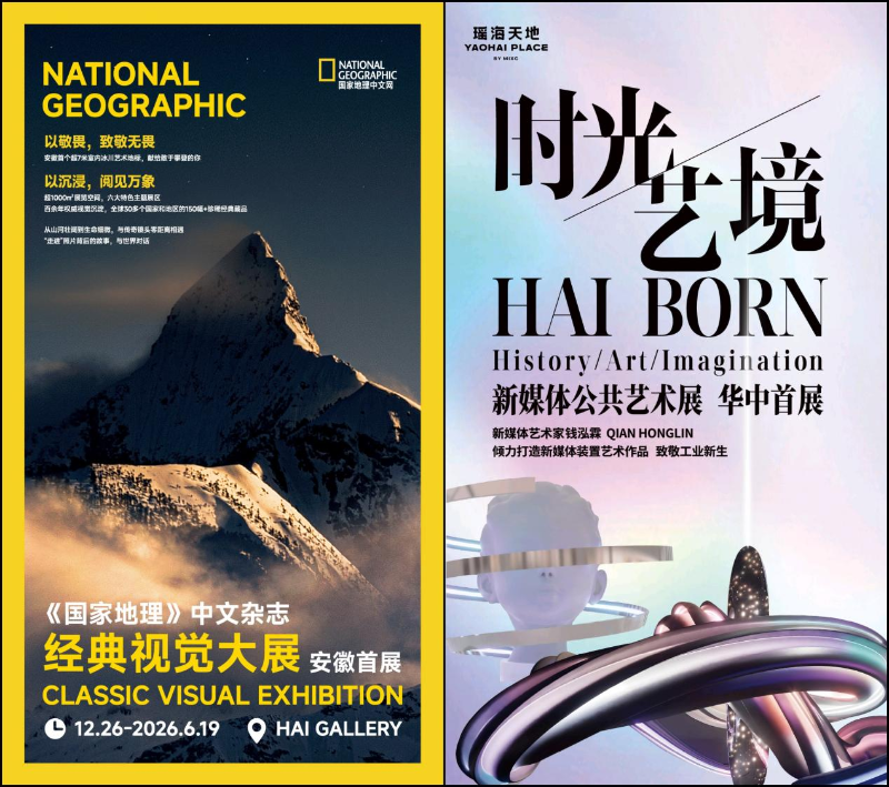 《國家地理》中文雜志經(jīng)典視覺大展安徽首展,全球30多個國家和地區(qū)的150余幅珍稀經(jīng)典藏品等你打卡;新媒體公共藝術(shù)展華中首展,藝術(shù)家錢泓霖傾力打造新媒體裝置藝術(shù)作品,致敬工業(yè)新生。