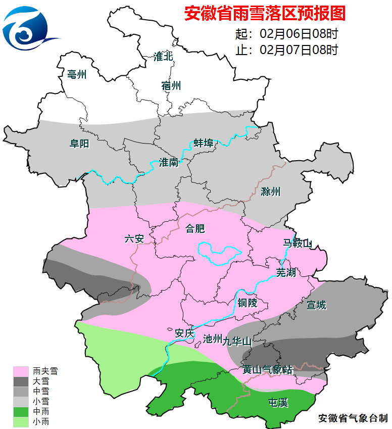 6日(周五):全省陰天?;春右员蹦喜亢突春右阅嫌行∮?,其中江南南部中雨;江北和江南中東部轉(zhuǎn)雨夾雪或小雪,其中大別山區(qū)和江南東部中到大雪,高海拔山區(qū)大到暴雪。